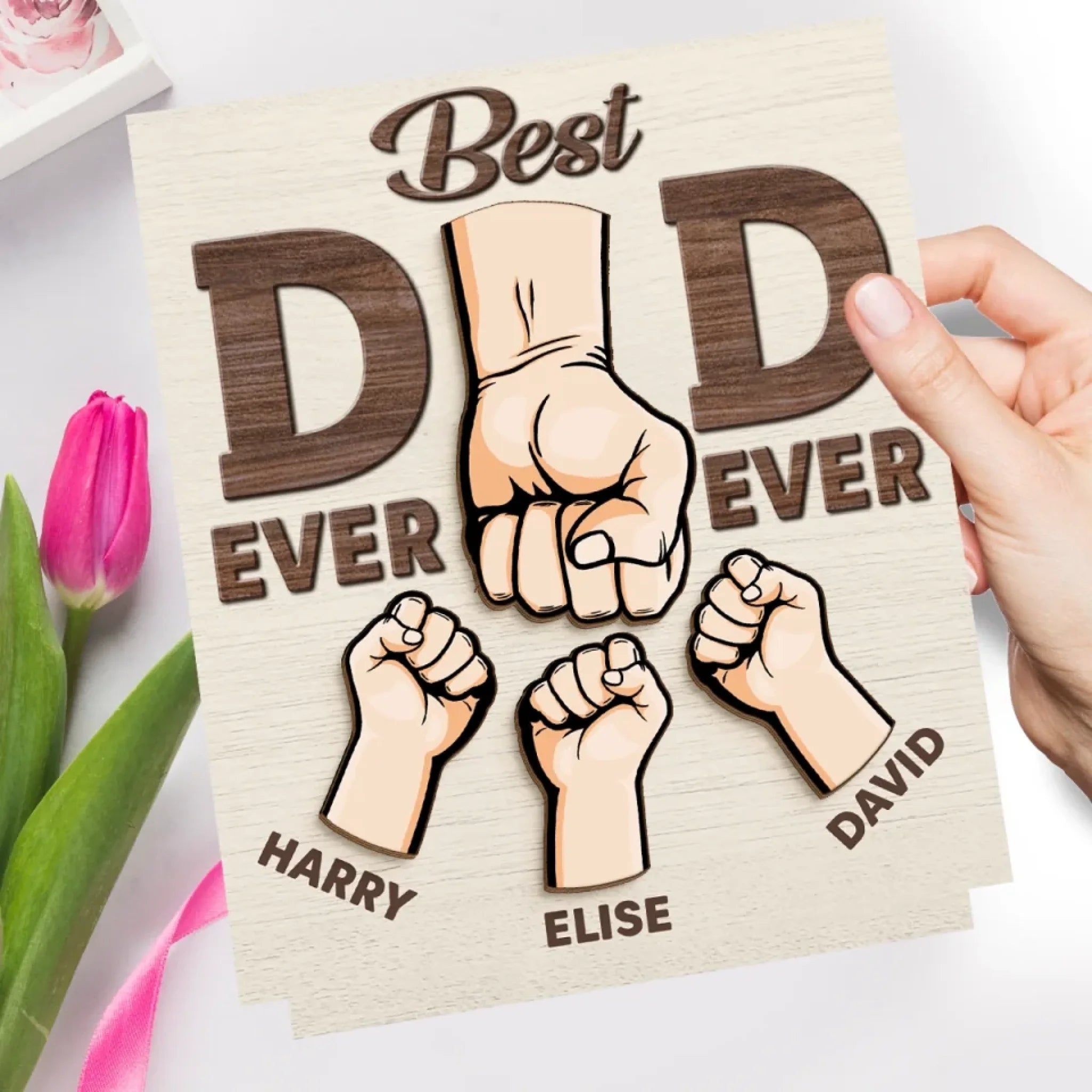 Behind Every Tiny Fist Is A Big Love For Dad - Family Personalized Custom Shaped 2-Layered Wooden Plaque With Flat Stand - Father's Day, House Warming Gift For Dad